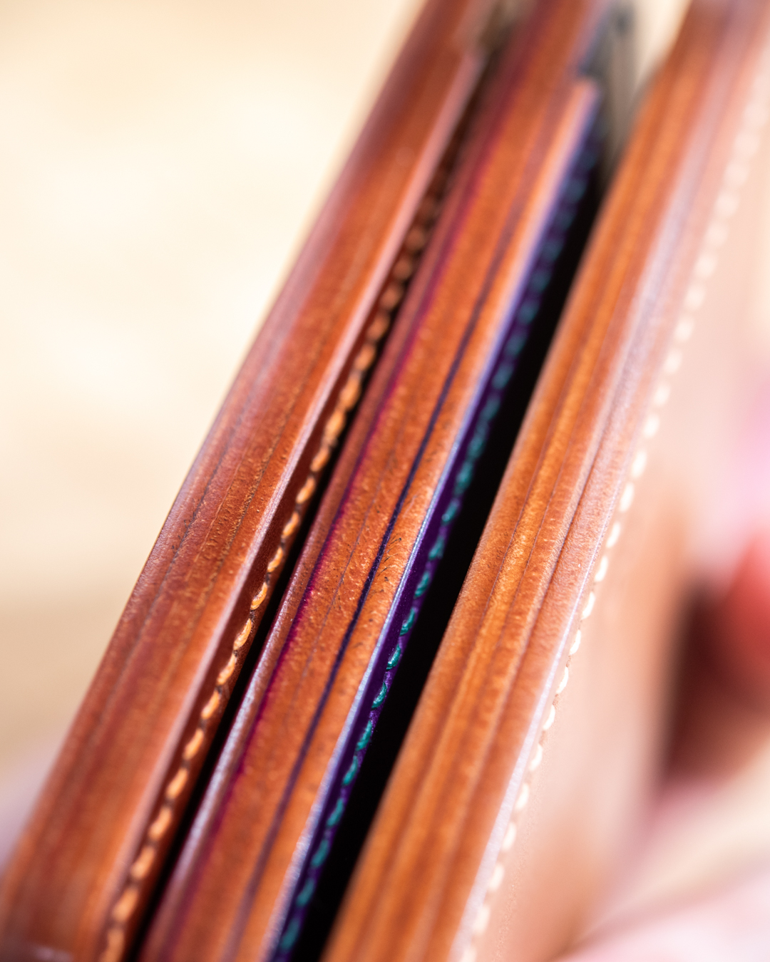 For cowhide, we primarily work with leather from our two favorite Italian tanneries: Conceria Walpier Buttero leather and Badalassi Carlo Minerva. Additionally, we love Pueblo, also by Badalassi Carlo. Our cowhide wallets are lined with a matching, lightly textured leather inside the cash slot. If you’d like to specify lining color, simply add it to your order notes.