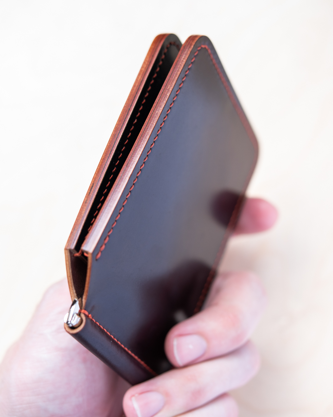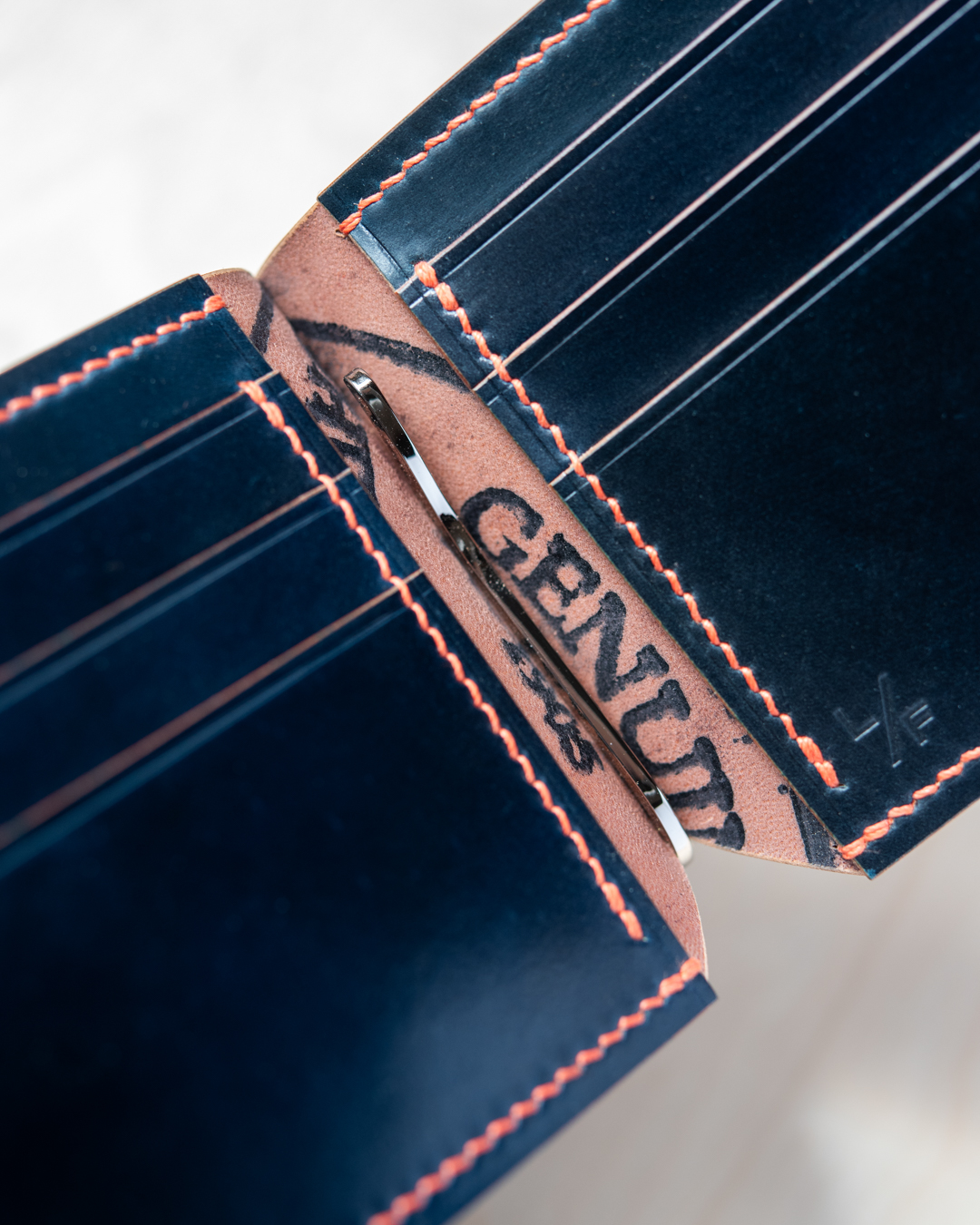 For cowhide, we primarily work with leather from our two favorite Italian tanneries: Conceria Walpier Buttero leather and Badalassi Carlo Minerva. Additionally, we love Pueblo, also by Badalassi Carlo. Our cowhide wallets are lined with a matching, lightly textured leather on the interior of the main panel as well as inside the hidden pockets. If you’d like to specify lining color, simply add it to your order notes.