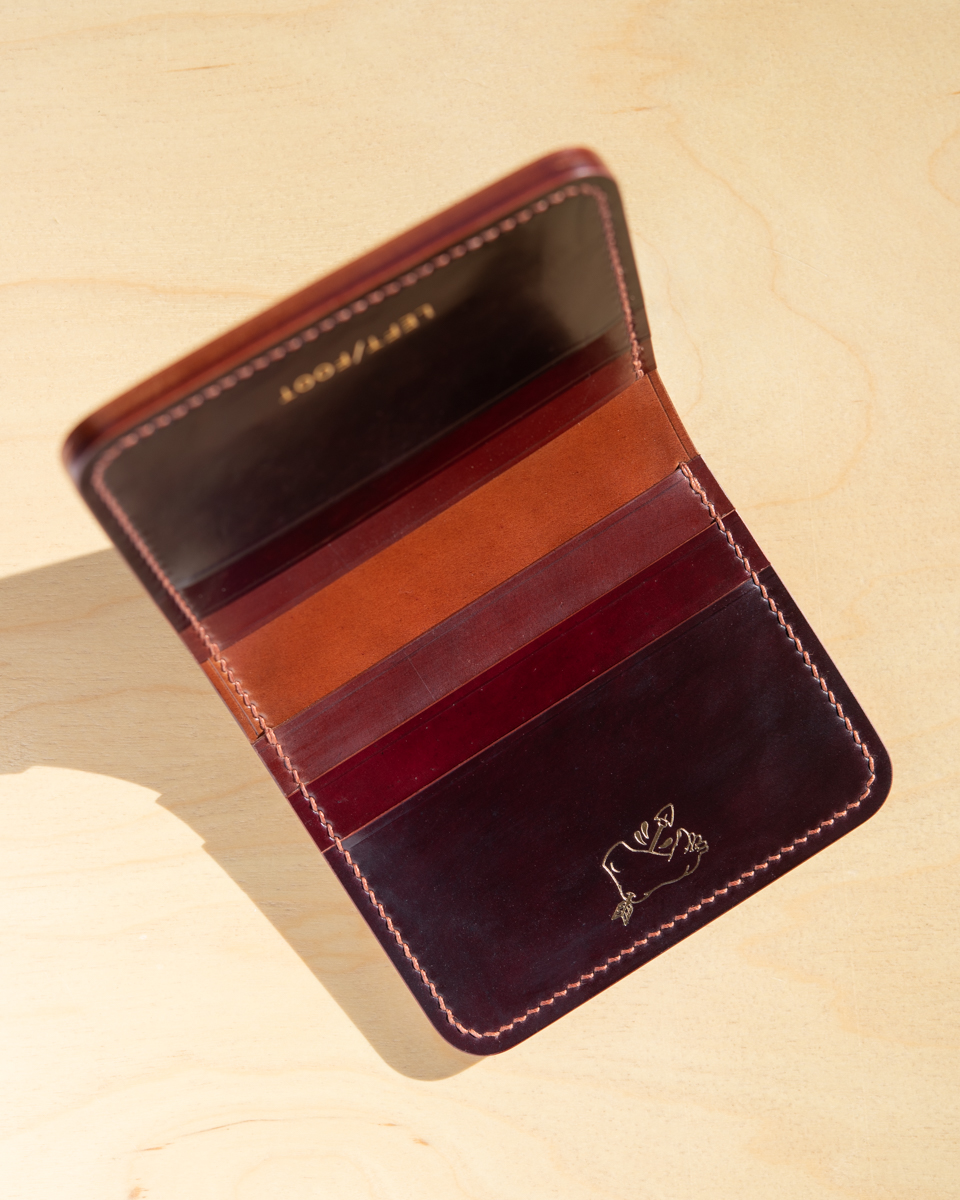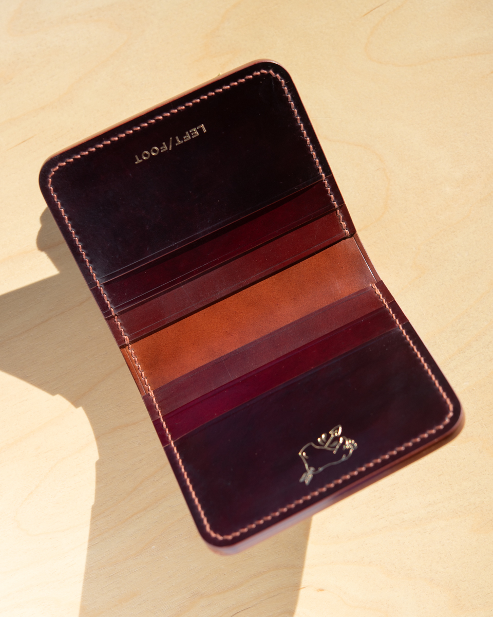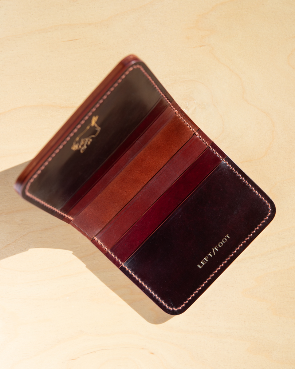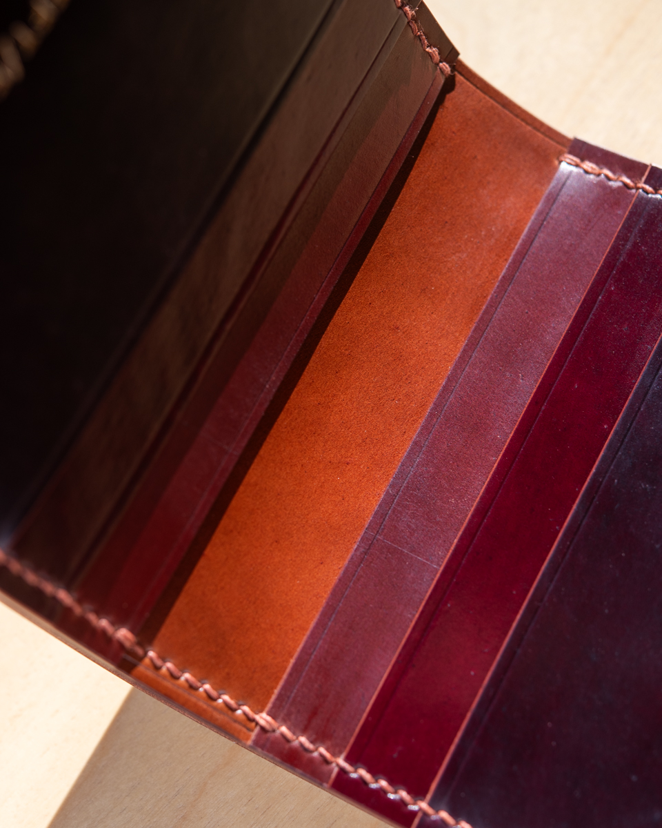 This particular compact wallet is crafted from a colorful mix of Horween “numbered” cordovan. To be exact, the interior consists of colors No.2, No.4, No.6, and No.8 with a deep burgundy No.8 exterior.