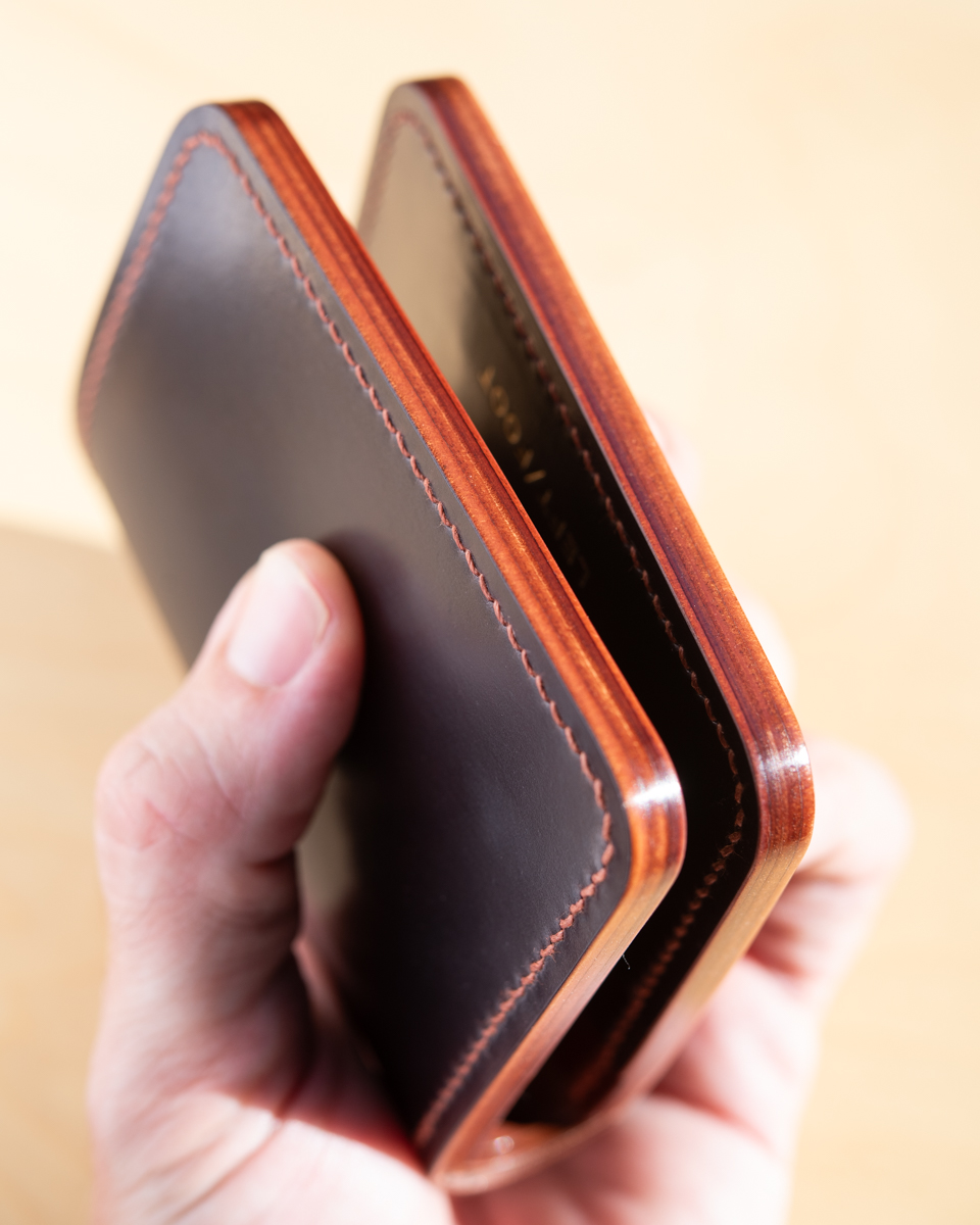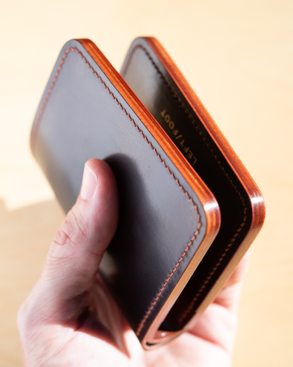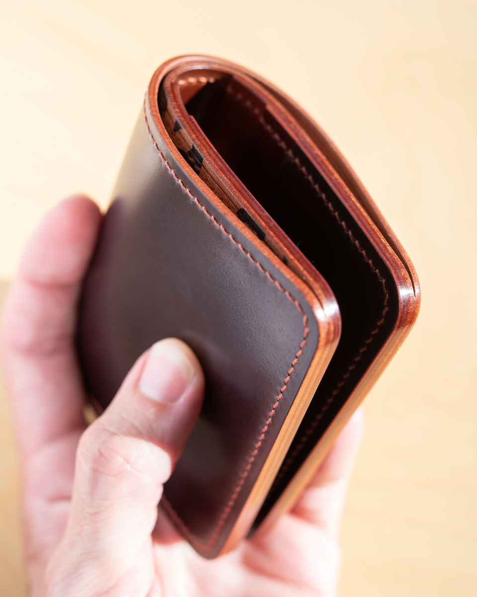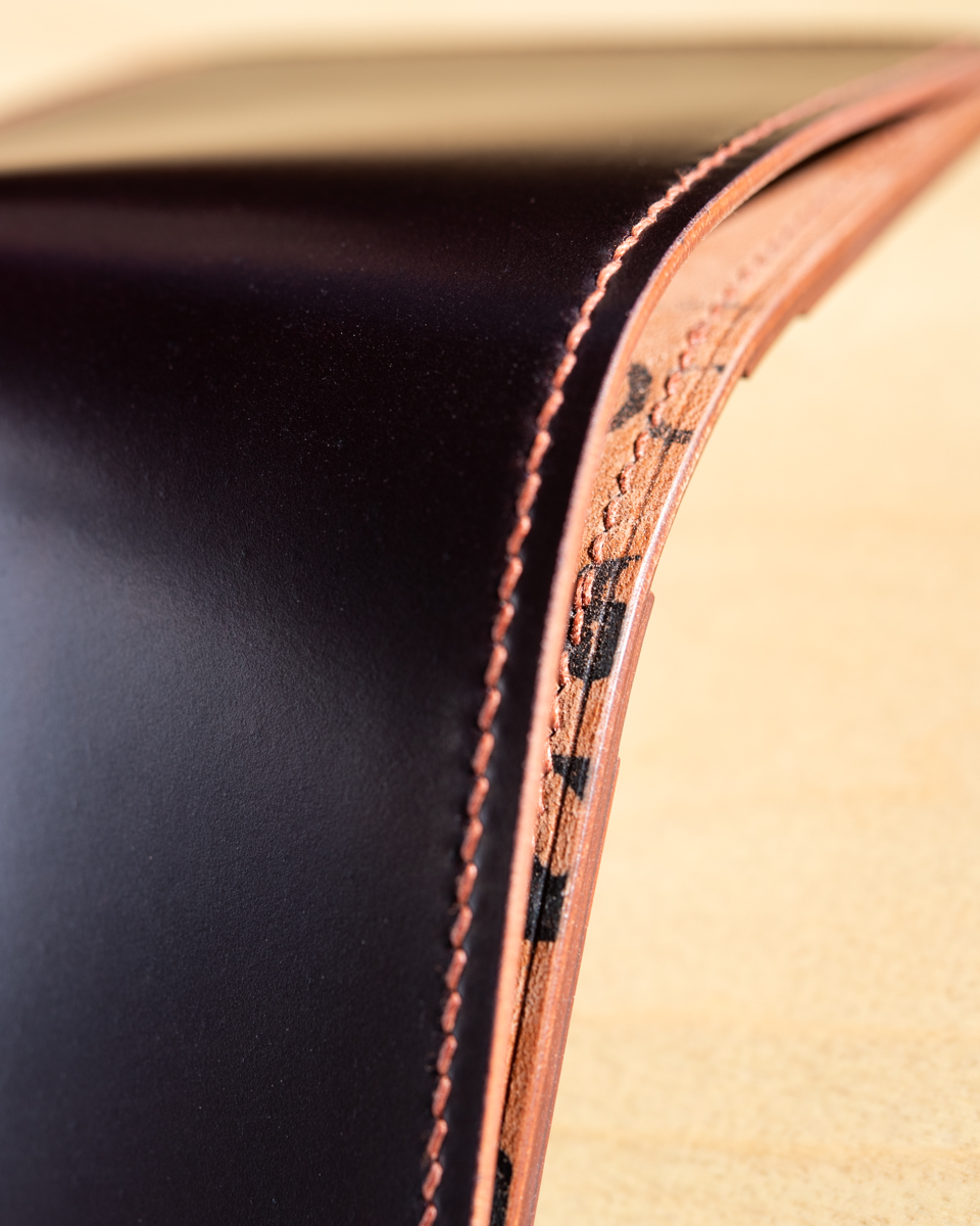 This particular compact wallet is crafted from a colorful mix of Horween “numbered” cordovan. To be exact, the interior consists of colors No.2, No.4, No.6, and No.8 with a deep burgundy No.8 exterior.